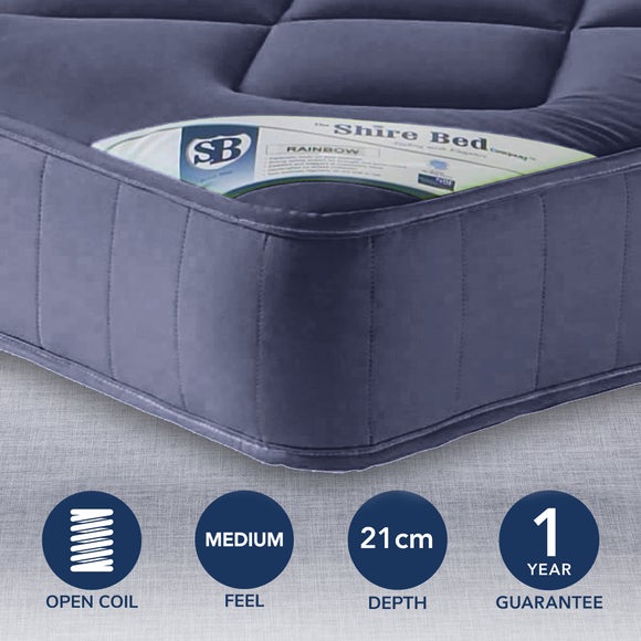 Designed for support and optimal comfort, this coil sprung mattress is a great choice for any bed. ”? 13.5-gauge spring unit ”? 6 gauge rod edge wire ”? National Bed Federation (NBF) approved Featuring a 13.5-gauge spring unit and 6-gauge rod edge wire, the Living Shire Rainbow Mattress provides a stable and supportive sleep surface for a more refreshing sleep. Generous layers of fillings make this mattress luxuriously comfortable to sleep on. Please note: Price is for mattress only. Please note, unfortunately we cannot deliver this item to the Channel Islands. * For health and hygiene reasons, we are unable to offer refunds or exchanges on Mattresses unless they are returned unused and in their original packaging. For more information please see our Easy Returns section. For more information on different mattress types, please visit our Mattress buying guide. Click here for more information.